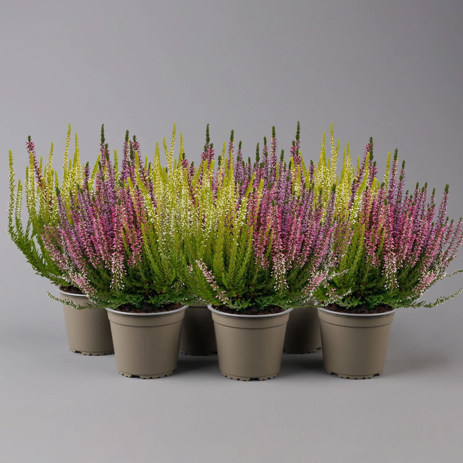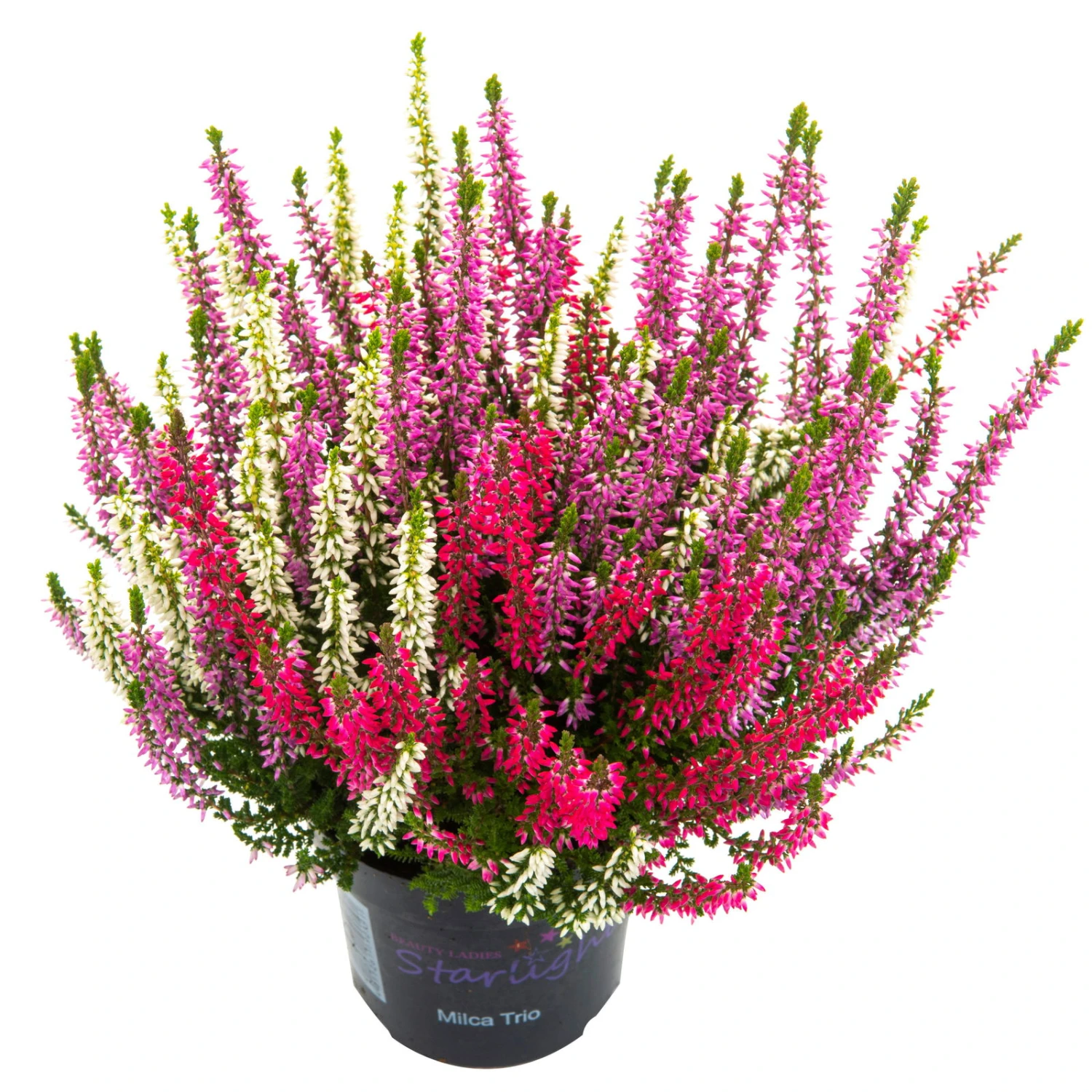 Die kleinen Blüten erscheinen bei der Knospenheide nur, wie der Name erahnen lässt, als Knospen und blühen nicht auf. Dadurch kann ihnen weder Wind noch Regen etwas anhaben und die farbigen Knospen bleiben bis in den Winter hinein schön. Die Calluna vulgaris ‚Starlight® Milca-Trio‘ ist ein Topf, in dem 3 verschiedenen Sorten Knospenheide zusammen kultiviert wurden. Die Calluna vulgaris ‚Starlight® Milca-Trio‘ bringt durch die Farben lila, rot & weiß mit gelben Laub oder lila, rot & weiß Abwechslung in Ihre Bepflanzung.