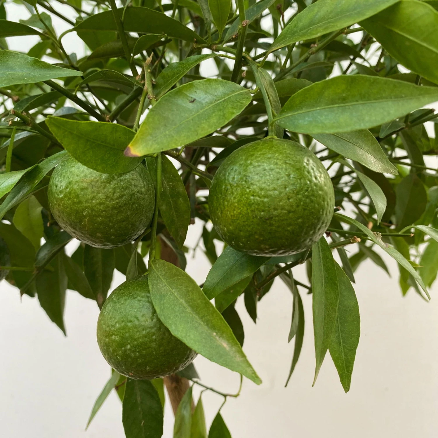 Die länglich ovalen, vorne zugespitzten Blätter des Mandarinenbaumes (Citrus reticulata) begeistern das ganze Jahr über mit satt grüner Farbe. Das Mandarinenbäumchen wächst von Natur aus bei ausreichender Helligkeit kompakt und dicht buschig. Sollten es doch etwas locker wachsen, können Sie durch Rückschnitt die Verzweigung anregen und somit die Krone kompackter gestalten. Die mediterrane Kübelpflanze kann eine Wuchshöhe von 1,50 -2,50 Metern erreichen.