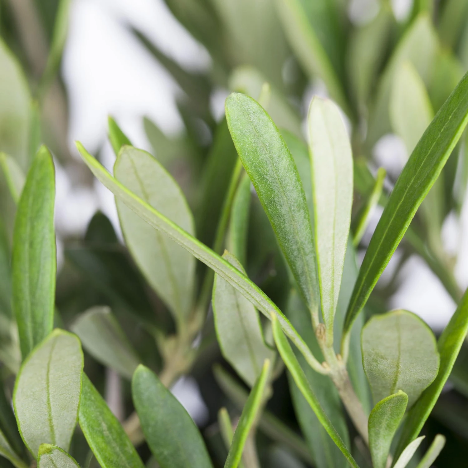 Die Olive (Olea europaea ‚Bonsai‘) überzeugt mit ihren charakteristisch grün und silbergrauen, schmalen Blättern und der silbrig anmutenden Rinde. Die Blätter stehen wechselständig an kurzen Stielen. Die Olive, auch Ölbaum genannt, stammt ursprünglich aus dem Mittelmeerraum und ist seit Tausenden Jahren als Nutz- und Symbolpflanze bekannt. Die mediterrane Pflanze wächst sehr langsam und kann sich am Naturstandort zu beeindruckenden Bäumen von bis zu 20 Metern entwickeln. Im Kübel auf der Terrasse wird die Olive meist nicht größer als 2 Meter. Der Zusatz ‚Bonsai‘ bedeutet, dass diese Olive häufig geschnitten wurde, so dass die Krone sehr dicht und kompakt gewachsen ist.